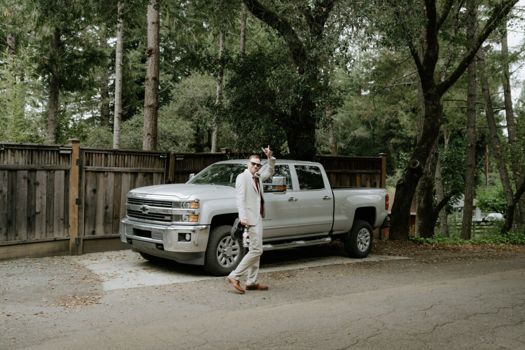 We started the day at their cozy Airbnb tucked in the Russian River area, close to Armstrong Redwoods and full of relaxed, woodsy charm. While Shay had her makeup done, I captured their beautiful details (peep the flowers and that super precious baby announcement 🥹). Their moms were both there, sipping champagne and watching their kids get ready. It was a wonderful morning together.